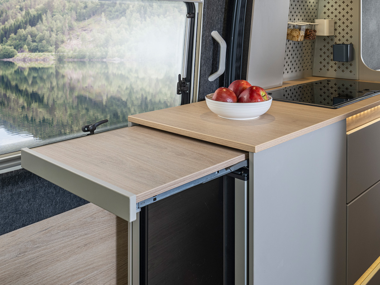 Lampička na čtení v kabině řidiče, USB zásuvky v kuchyni a v oblasti toalety, Ambientní osvětlení v obývací části, Zásuvka 230V v zadní části 2ks, Zásuvka na 230V v kuchyni 1ks, Zásuvka na 12V 1ks, LED osvětlení nad posuvnými dveřmi
