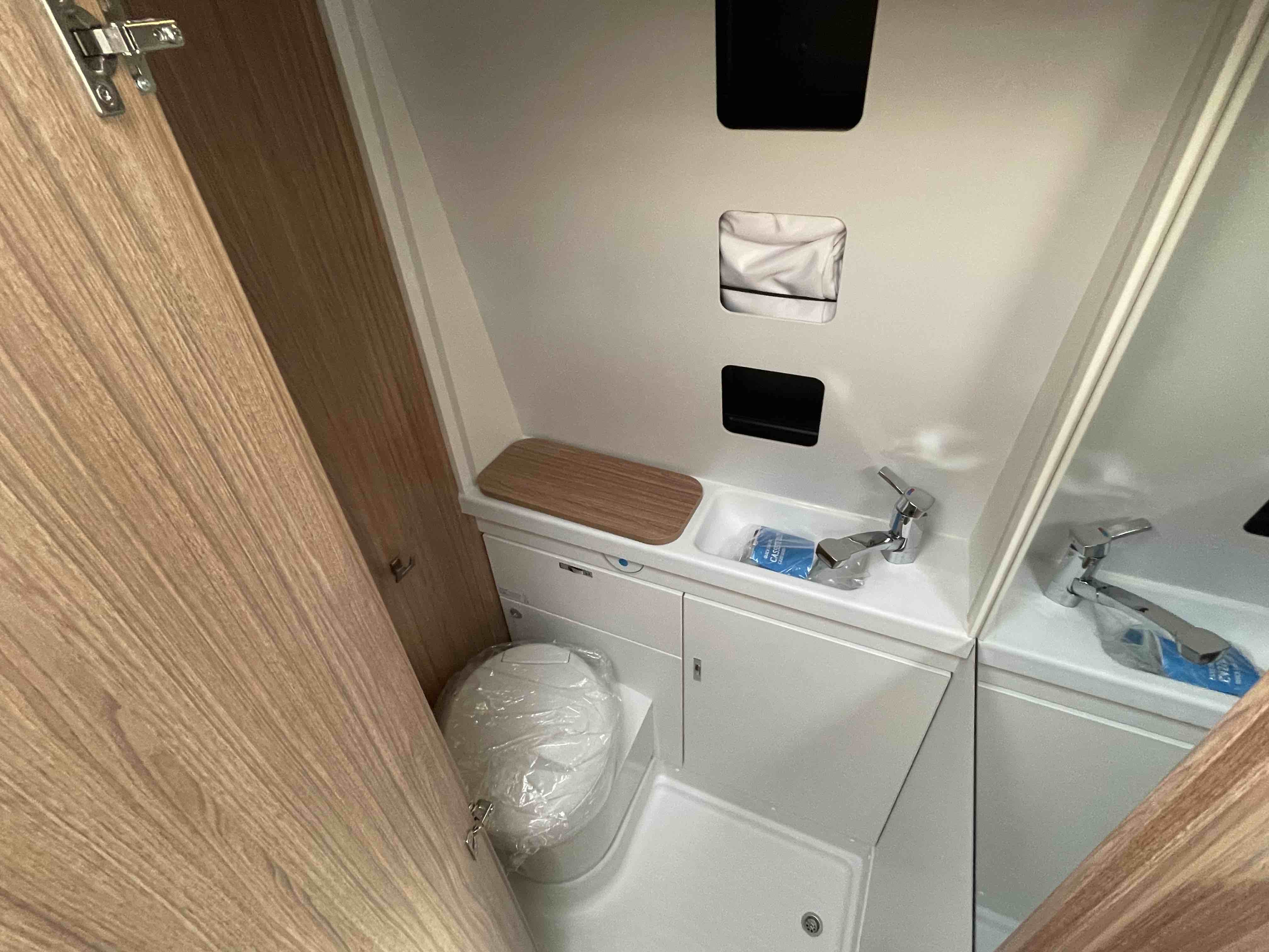 - WC / sprchový kout s umyvadlem, kazetovým WC, posuvným zrcadlem a úložnými prostory
