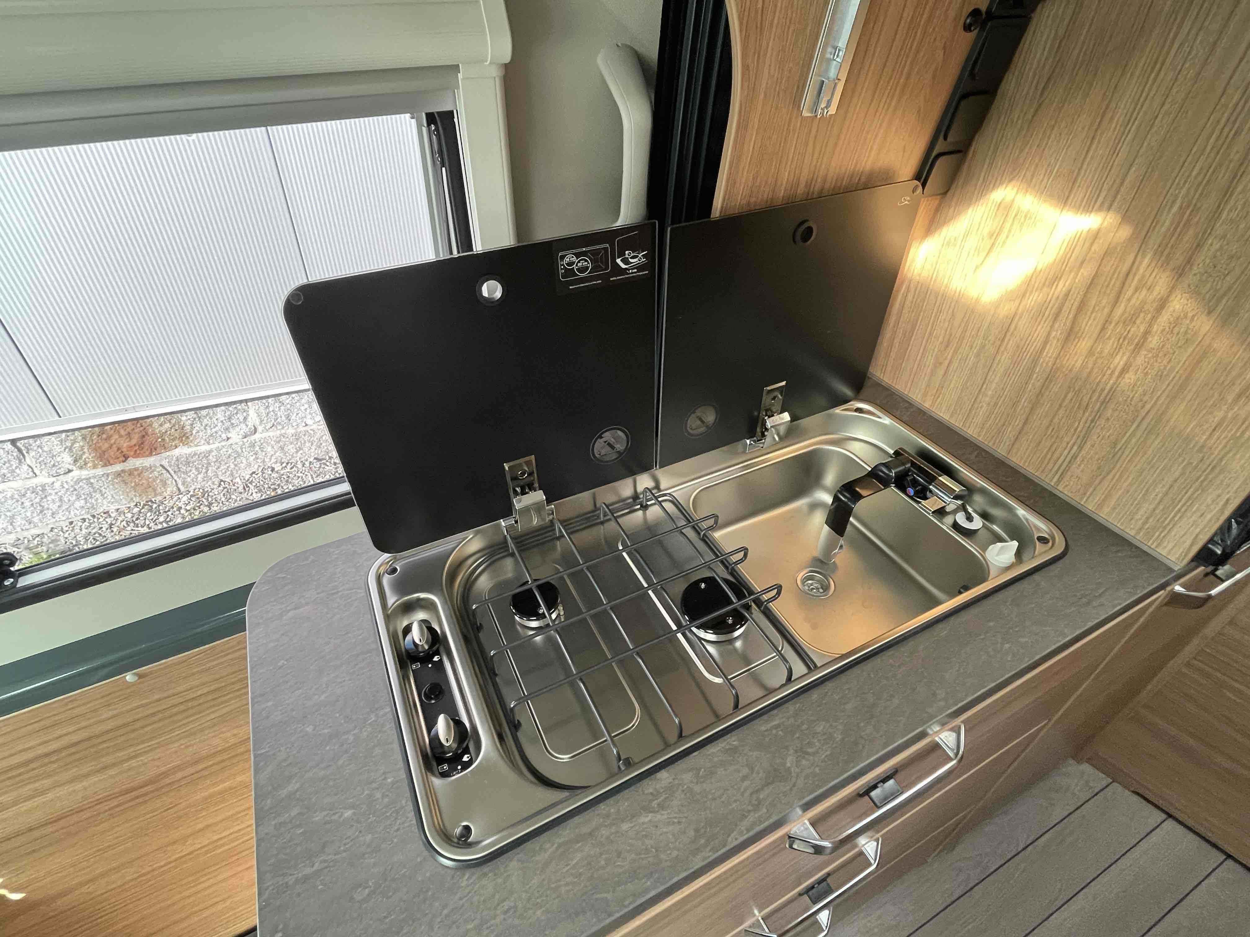 - 2 plotýnkový sporák se skleněnou poklicí, samostatný dřez